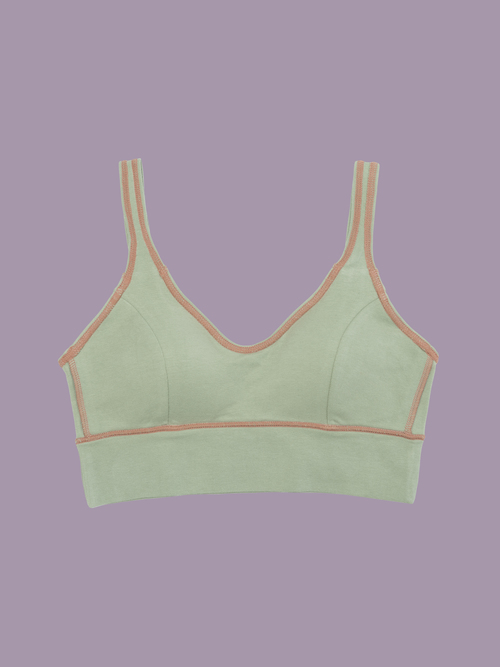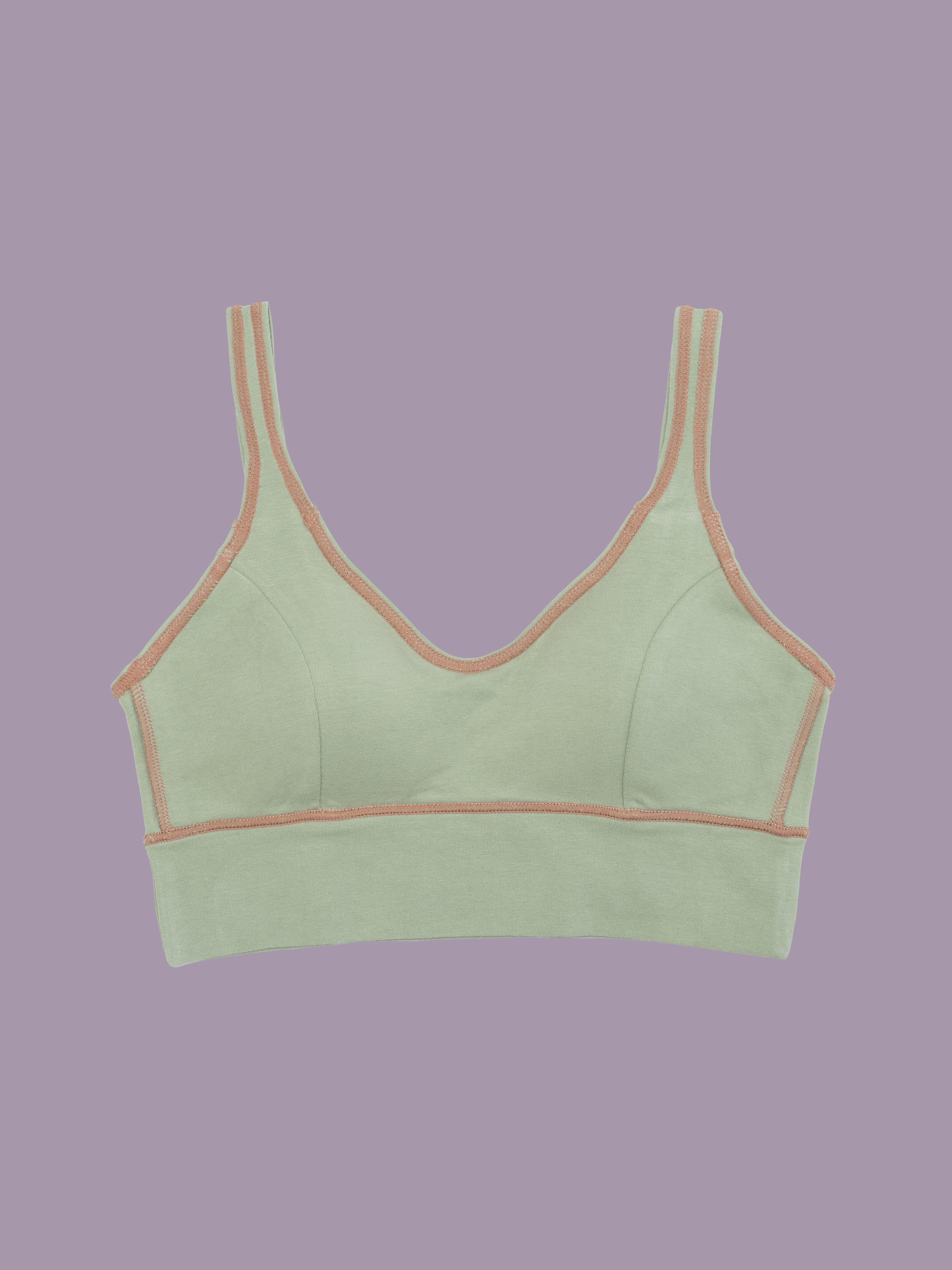 淡いグリーンの生地に、オレンジベージュのほんのり光沢のあるステッチを合わせることで、爽やかさの中にもやわらかなニュアンスが生まれました。